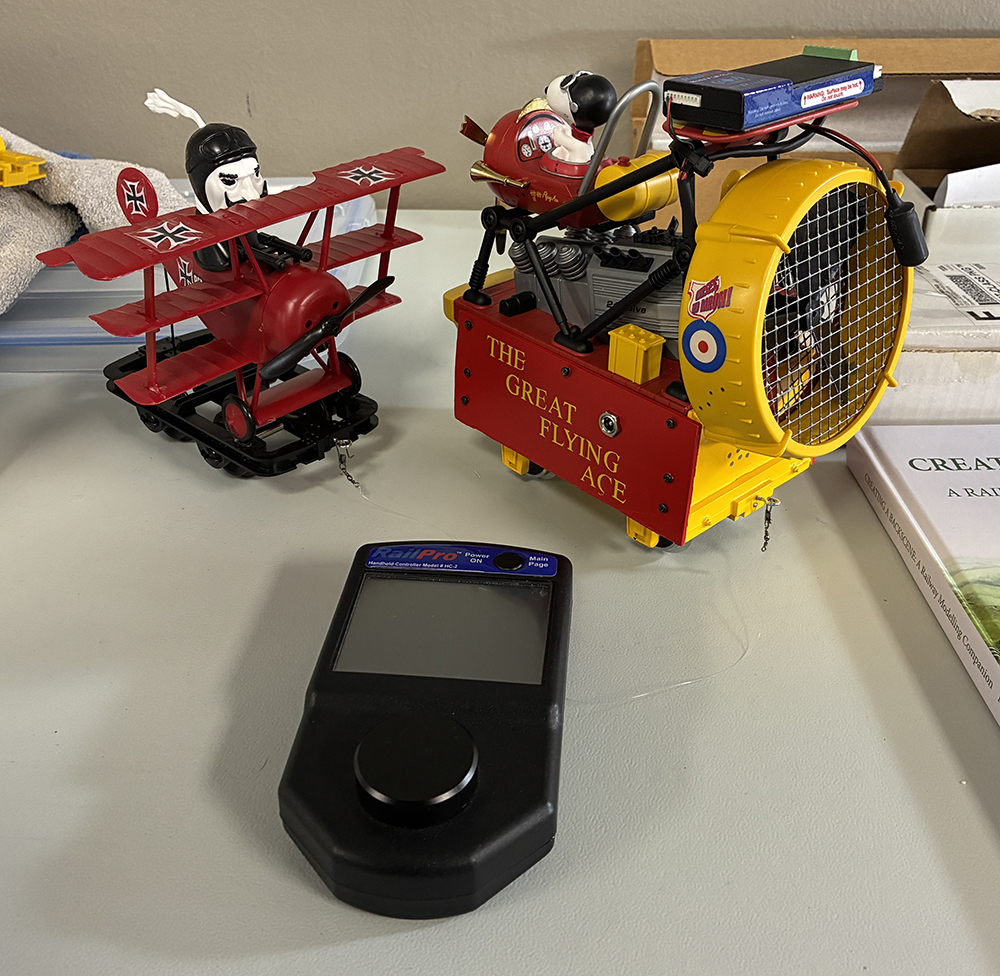 Nancy Whitehill displayed a home-made novelty G-gage Loco depicting the Peanuts character Snoopy. It was made to run on rails or the floor using a remote control device rather than track power. She also showed us a model of a WWI 3 wing triplane with the Red Baron which would follow Snoopy using a filament. It also ran on the floor using a remote control device. A big hit with the membership!